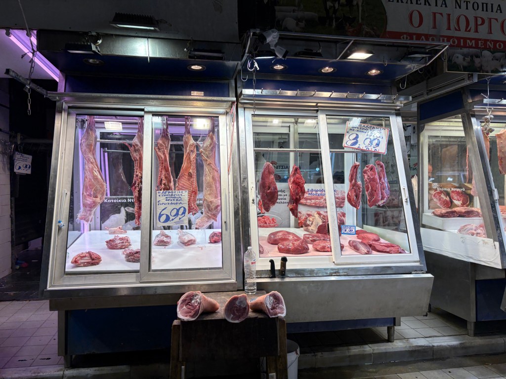 It was all rainbows and butterflies before my exploring soles led me into a Greek meat market…Immediately I was too far in before realizing how wretched the scents and visuals were to stomach. Moments prior, I had been on a perfect dreamy adventure. Life surely can take a turn.